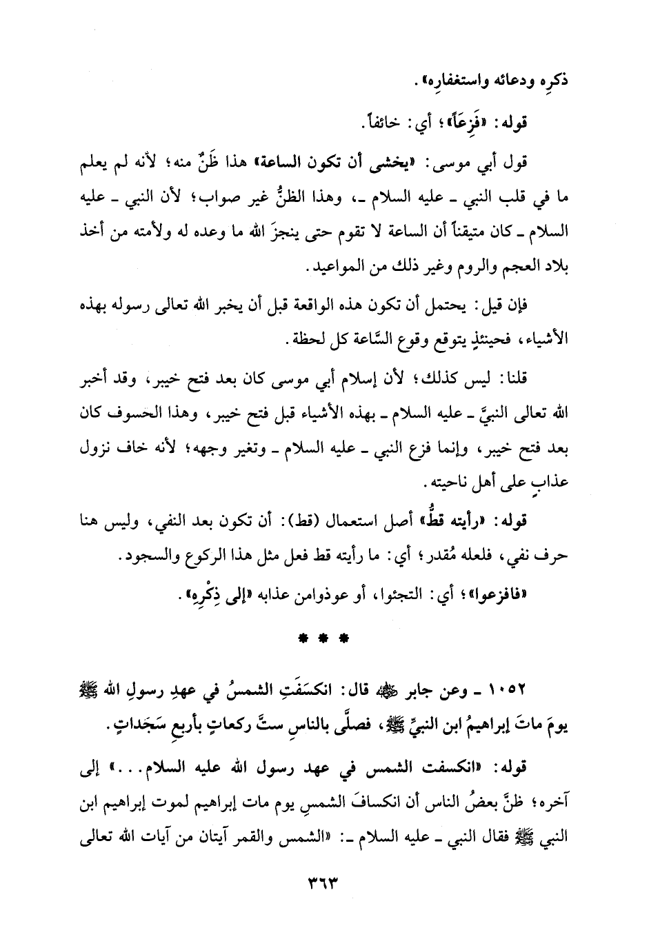 1052 - وعن جابر - رضي الله عنه - قال: انكسَفَتِ الشمسُ في عهدِ رسولِ الله - صلى الله عليه وسلم - يومَ ماتَ إبراهيمُ ابن النبيِّ - صلى الله عليه وسلم -، فصلَّى بالناسِ ستَّ ركعاتٍ بأربعِ سَجداتٍ.