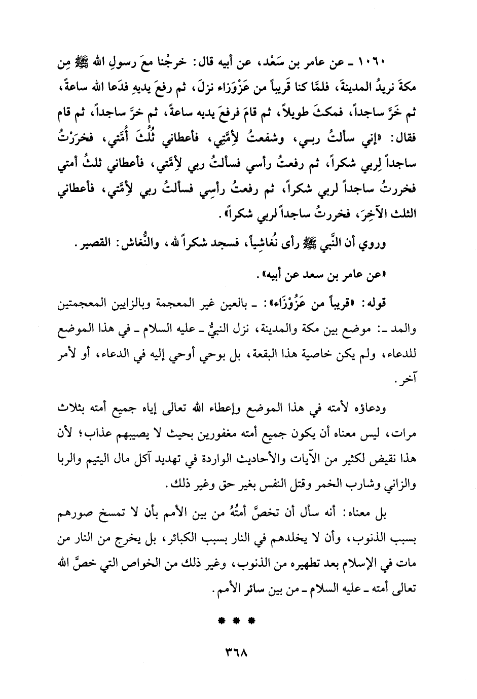 1060 - عن عامر بن سَعْد، عن أبيه قال: خرجْنا معَ رسولِ الله - صلى الله عليه وسلم - مِن مكةَ نريدُ المدينةَ، فلمَّا كنا قَريبًا من عَزْوَزاء نزلَ، ثم رفعَ يديهِ فدَعا الله ساعةً، ثم خَرَّ ساجدًا، فمكثَ طويلًا، ثم قامَ فرفعَ يديه ساعةً، ثم خرَّ ساجدًا، ثم قام فقال: "إني سألتُ ربي، وشفعتُ لأِمَّتِي، فأعطاني ثُلُثَ أُمَّتي، فخرَرْتُ ساجدًا لِربي شكرًا، ثم رفعتُ رأسي فسألتُ ربي لأمَّتي، فأعطاني ثلثُ أمتي فخررتُ ساجدًا لربي شكرًا، ثم رفعتُ رأسِي فسألتُ ربي لأِمَّتي، فأعطاني الثلث الآخِرَ، فخررتُ ساجدًا لربي شكرًا".