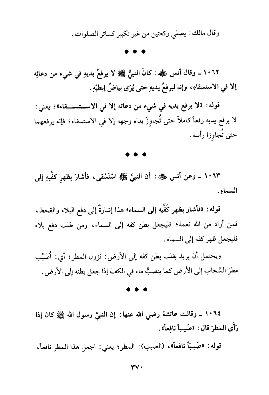 1063 - وعن أنس - رضي الله عنه -: أن النبيَّ - صلى الله عليه وسلم - اسْتَسْقى، فأشارَ بظهرِ كفَّيهِ إلى السماءِ.