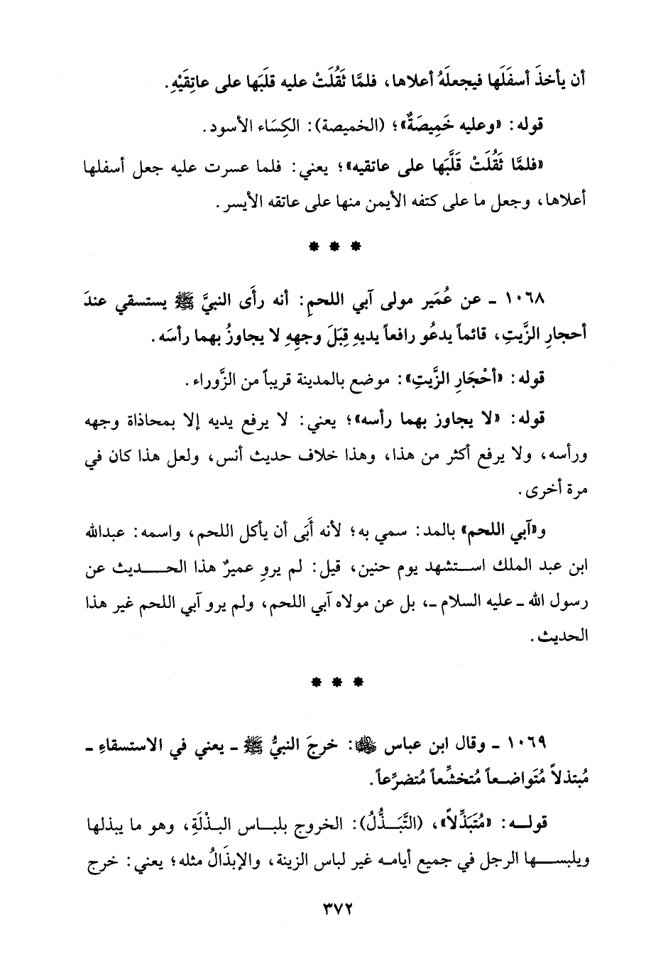 1068 - عن عُمَير مولى آبي اللحمِ: أنه رأَى النبيَّ - صلى الله عليه وسلم - يستسقي عندَ أحجارِ الزَّيتِ، قائمًا يدعُو رافعًا يديهِ قِبَلَ وجهِهِ لا يجاوزُ بهما رأسَه.