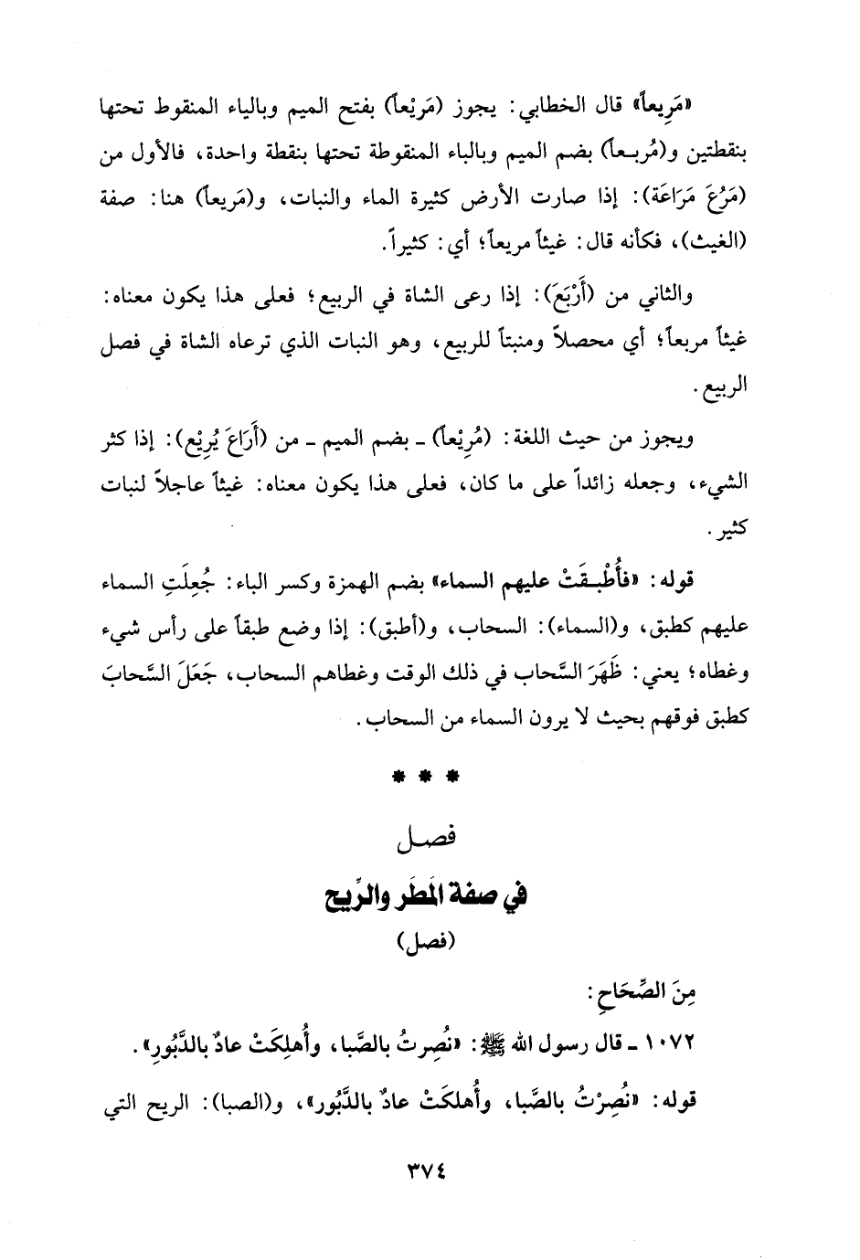والثاني من (أَرْبَعَ): إذا رعى الشاة في الربيع؛ فعلى هذا يكون معناه: غيثًا مربعًا؛ أي محصلًا ومنبتًا للربيع، وهو النبات الذي ترعاه الشاة في فصل الربيع.