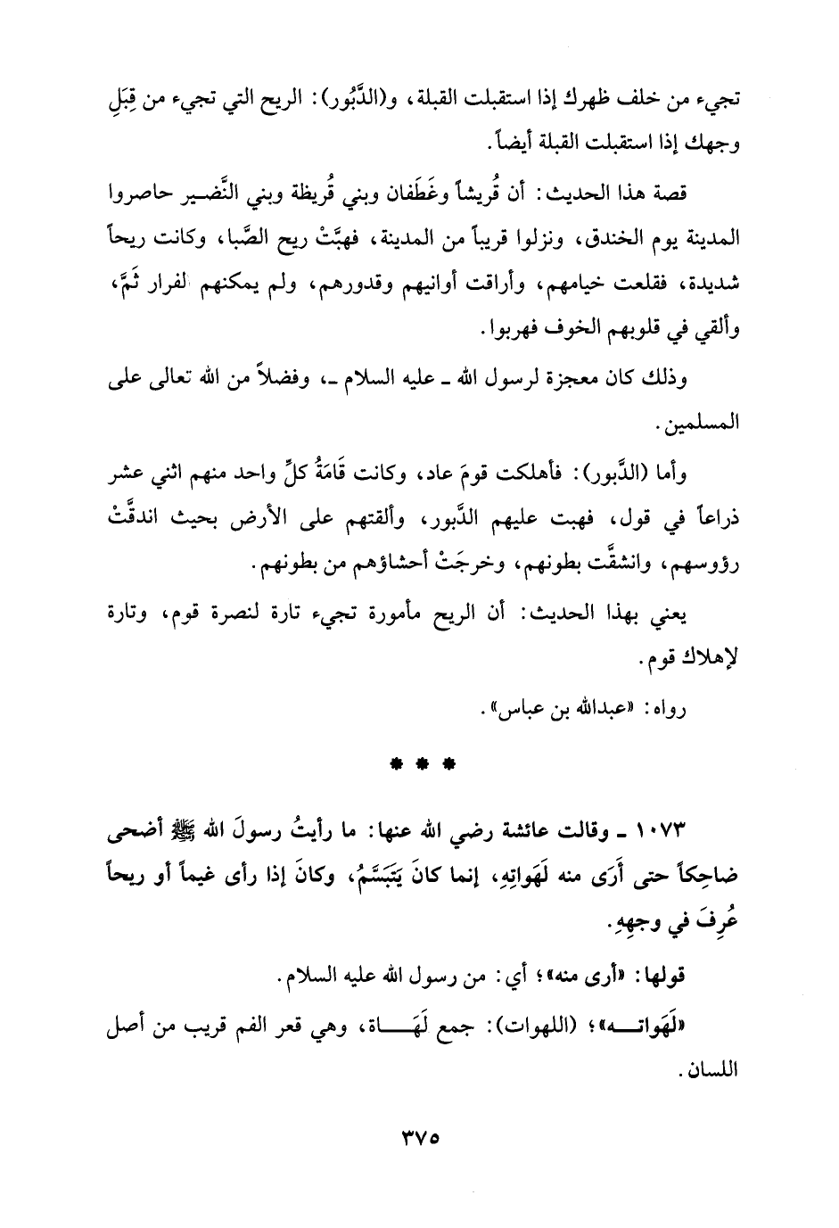 1073 - وقالت عائشة رضي الله عنها: ما رأيتُ رسولَ الله - صلى الله عليه وسلم - أضحى ضاحِكًا حتى أَرَى منه لَهَواتِهِ، إنما كانَ يَتَبَسَّمُ، وكانَ إذا رأى غيمًا أو ريحًا عُرِفَ في وجهِهِ.