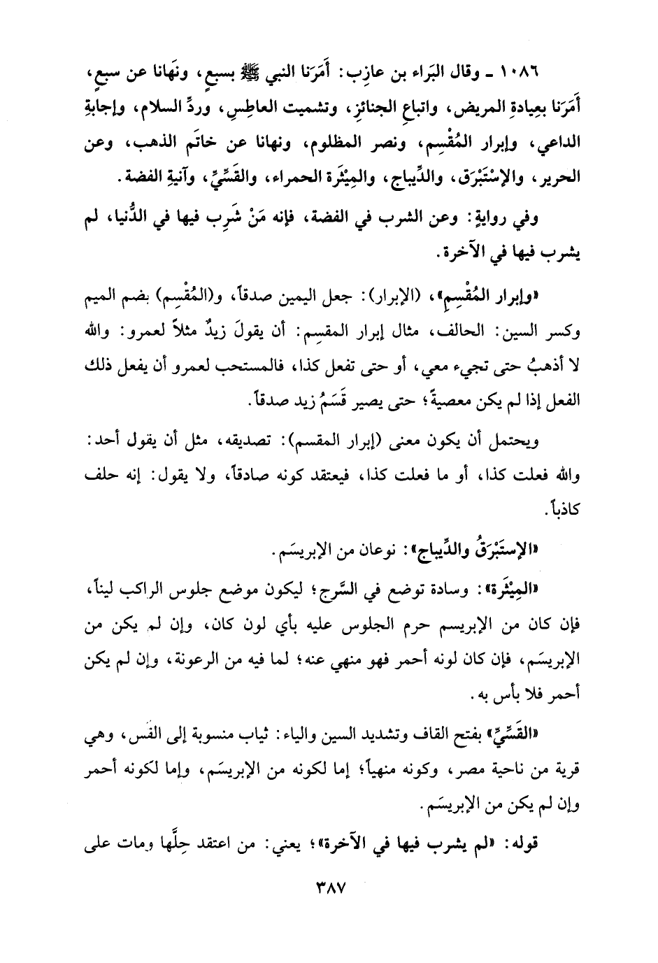 1086 - وقال البَراء بن عازِب: أَمَرَنا النبي - صلى الله عليه وسلم - بسبعٍ، ونَهانا عن سبعٍ، أَمَرَنا بعِيادةِ المريض، واتباعِ الجنائزِ، وتشميت العاطِسِ، وردِّ السلام، وإجابةِ الداعي، وإبرار المُقْسِم، ونصر المظلوم، ونهانا عن خاتَم الذهب، وعن الحرير، والإسْتَبْرَق، والدِّيباج، والمِيْثَرة الحمراء، والقَسِّيِّ، وآنيةِ الفضة.
