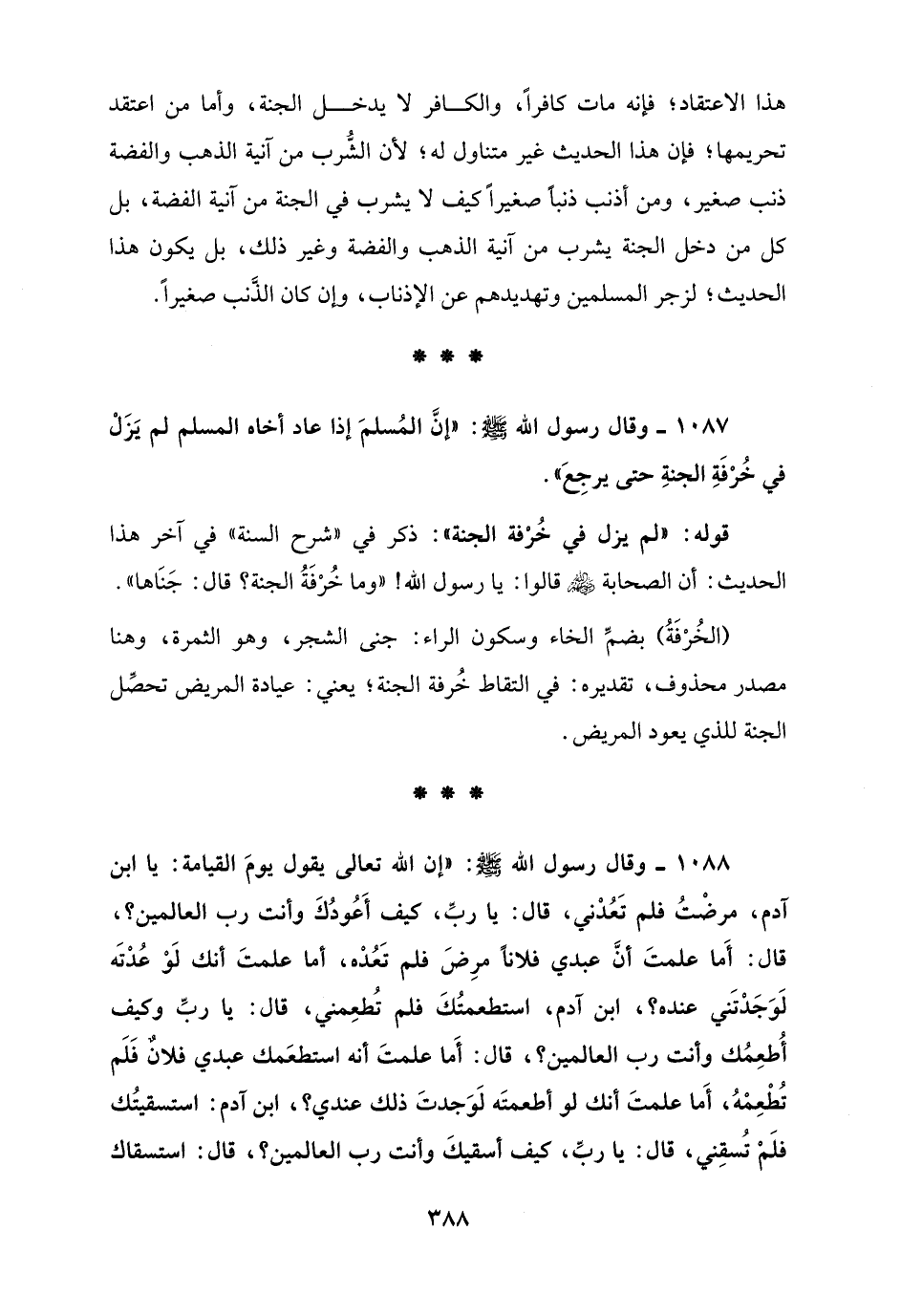 1087 - وقال رسول الله - صلى الله عليه وسلم -: "إنَّ المُسلمَ إذا عاد أخاه المسلم لم يَزَلْ في خُرْفَةِ الجنةِ حتى يرجِعَ".