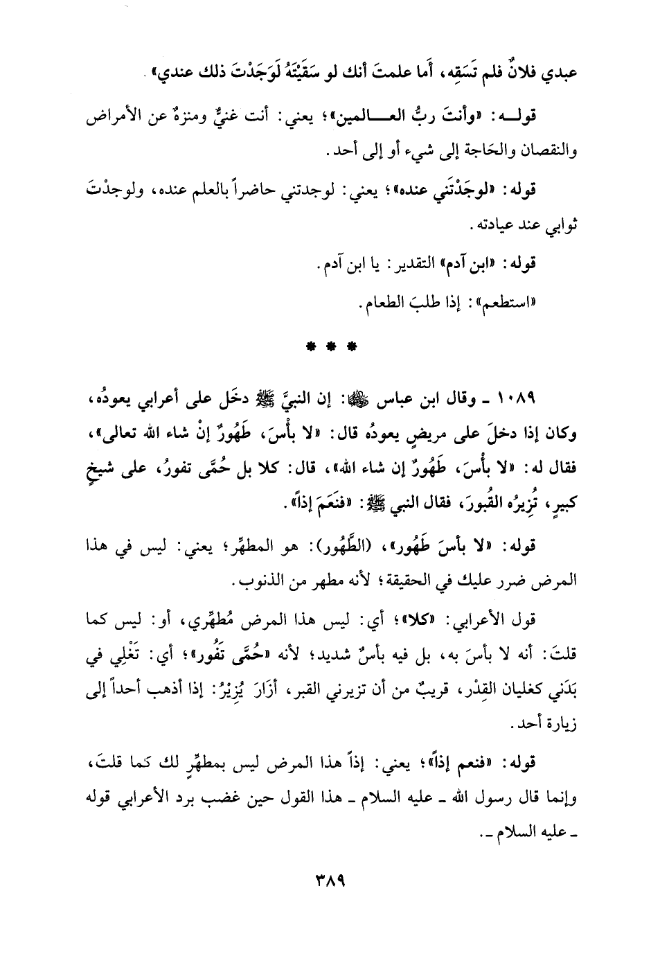 1089 - وقال ابن عباس - رضي الله عنهما -: إن النبيَّ - صلى الله عليه وسلم - دخَل على أعرابي يعودُه، وكان إذا دخلَ على مريضٍ يعودُه قال: "لا بأْسَ، طَهُورٌ إنْ شاء الله تعالى"، فقال له: "لا بأْسَ، طَهُورٌ إن شاء الله"، قال: كلا بل حُمَّى تفورُ، على شيخٍ كبيرٍ، تُزِيرُه القُبورَ، فقال النبي - صلى الله عليه وسلم -: "فنَعَمَ إذًا".