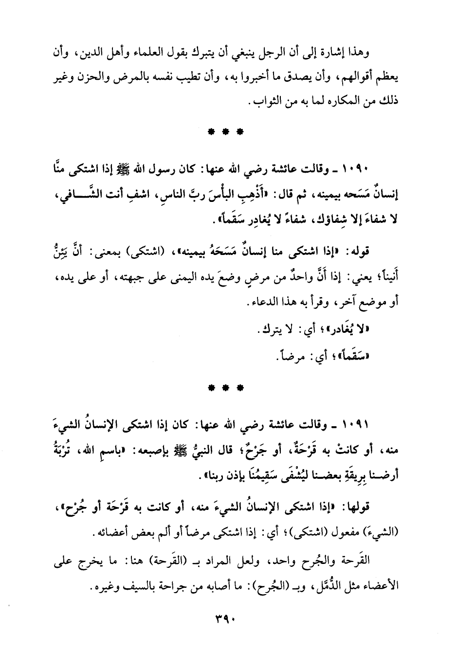 1090 - وقالت عائشة رضي الله عنها: كان رسول الله - صلى الله عليه وسلم - إذا اشتكى منَّا إنسانٌ مَسَحه بيمينه، ثم قال: "أَذْهِبِ البأْسَ ربَّ الناسِ، اشفِ أنت الشَّافي، لا شفاءَ إلا شِفاؤك، شفاءً لا يُغادِر سَقَمًا".