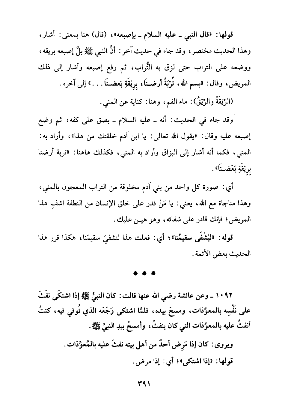1092 - وعن عائشة رضي الله عنها قالت: كان النبيُّ - صلى الله عليه وسلم - إذا اشتكَى نفَثَ على نَفْسِه بالمعوِّذات، ومسحَ بيده، فلمَّا اشتكى وَجَعَه الذي تُوفي فيه، كنتُ أنفثُ عليه بالمعوِّذات التي كان ينفثُ، وأمسحُ بيدِ النبيِّ - صلى الله عليه وسلم -.