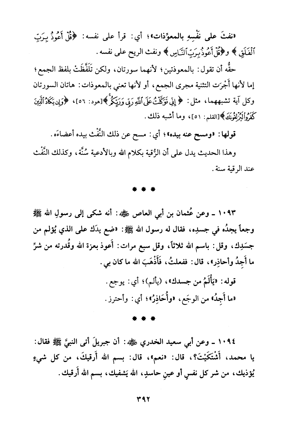 1093 - وعن عُثمان بن أبي العاص - رضي الله عنه -: أنه شكى إلى رسولِ الله - صلى الله عليه وسلم - وجعًا يجدُه في جسدِه، فقال له رسول الله - صلى الله عليه وسلم -: "ضع يدَك على الذي يُؤلم من جسَدِك، وقل: باسم الله ثلاثًا، وقل سبع مرات: أَعوذ بعزة الله وقُدرته من شرِّ ما أَجِدُ وأحاذِر"، قال: ففعلتُ، فَأذْهَبَ الله ما كان بي.