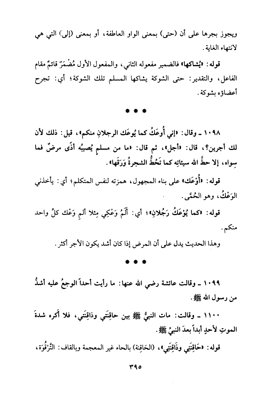 1099 - وقالت عائشة رضي الله عنها: ما رأيت أحدًا الوجعُ عليه أشدُّ من رسول الله - صلى الله عليه وسلم -.