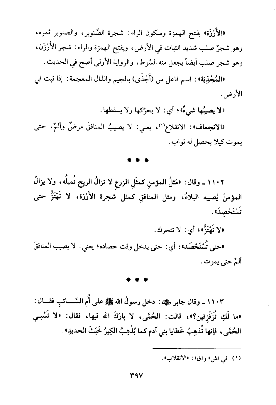 1102 - وقال: "مَثلُ المؤمنِ كمثَلِ الزرعِ لا تزالُ الريح تُميلُه، ولا يزالُ المؤمنُ يُصيبه البلاءُ، ومثل المنافقِ كمثل شجرة الأَرْزة، لا تَهْتَزُّ حتى تَسْتَحْصِدَ".