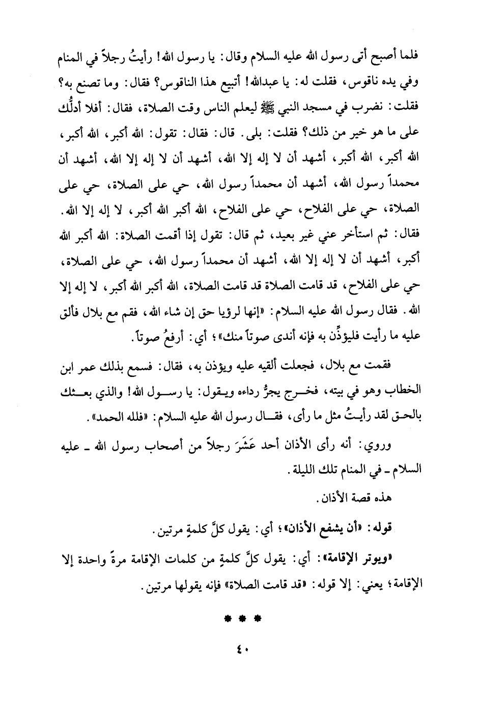 فلما أصبح أتى رسول الله عليه السلام وقال: يا رسول الله! رأيتُ رجلًا في المنام وفي يده ناقوس، فقلت له: يا عبد الله! أتبيع هذا الناقوس؟ فقال: وما تصنع به؟ فقلت: نضرب في مسجد النبي - صلى الله عليه وسلم - ليعلم الناس وقت الصلاة، فقال: أفلا أدلُّك على ما هو خير من ذلك؟ فقلت: بلى. قال: فقال: تقول: الله أكبر، الله أكبر، الله أكبر، الله أكبر، أشهد أن لا إله إلا الله، أشهد أن لا إله إلا الله، أشهد أن محمدًا رسول الله، أشهد أن محمدًا رسول الله، حي على الصلاة، حي على الصلاة، حي على الفلاح، حي على الفلاح، الله أكبر الله أكبر، لا إله إلا الله. فقال: ثم استأخر عني غير بعيد، ثم قال: تقول إذا أقمت الصلاة: الله أكبر الله أكبر، أشهد أن لا إله إلا الله، أشهد أن محمدًا رسول الله، حي على الصلاة، حي على الفلاح، قد قامت الصلاة قد قامت الصلاة، الله أكبر الله أكبر، لا إله إلا الله. فقال رسول الله عليه السلام: "إنها لرؤيا حق إن شاء الله، فقم مع بلال فألق عليه ما رأيت فليؤذِّن به فإنه أندى صوتًا منك"؛ أي: أرفعُ صوتًا.