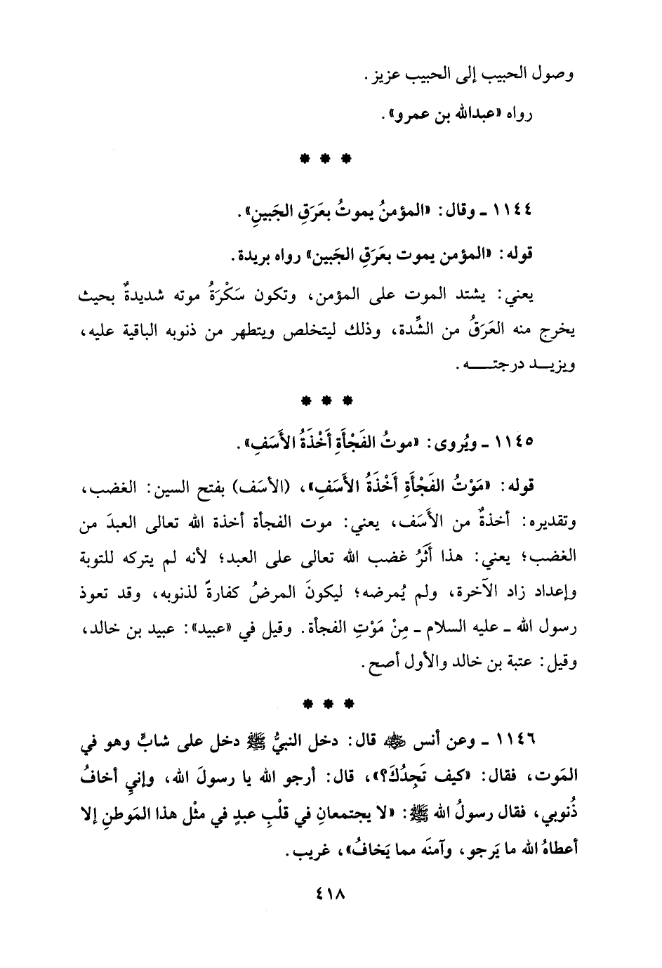 1144 - وقال: "المؤمنُ يموتُ بعَرَقِ الجَبينِ".