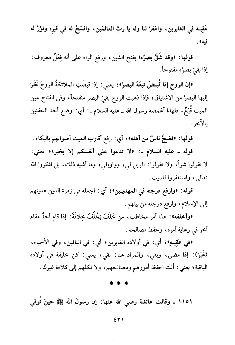 "إن الروح إذا قُبضَ تبعَهُ البصرُ"؛ يعني: إذا قبضَتِ الملائكةُ الروحَ نَظَرَ إليها البصرُ من الاشتياق، فإذا ذهبت الروح بقيَ البصر منفتحًا، وفي انفتاح عين الميت قُبْحٌ، فلهذا أغمضه رسول الله - عليه السلام -: أي: وضع أحد الجفنين بالآخر.