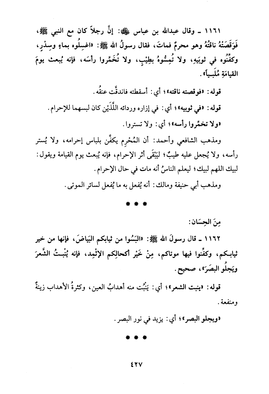 1161 - وقال عبد الله بن عباس - رضي الله عنهما -: إنَّ رجلًا كان مع النبي - صلى الله عليه وسلم -، فَوَقَصَتْهُ ناقتُهُ وهو محرمٌ فماتَ، فقال رسولُ الله - صلى الله عليه وسلم -: "اغسِلُوه بماءٍ وسِدْرٍ، وكفِّنُوه في ثوبَيهِ، ولا تُمِسُّوهُ بطِيْبٍ، ولا تُخَمِّروا رأسَه، فإنه يُبعث يومَ القيامَةِ مُلَبيًا".