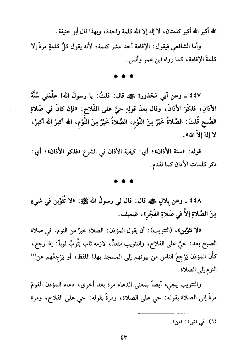 447 - وعن أبي مَحْذورة - رضي الله عنه - قال: قلتُ: يا رسولَ الله! علِّمْني سُنَّةَ الأذانِ، فذكَرَ الأذانَ، وقال بعدَ قولهِ حيَّ على الفَلاحِ: "فإن كانَ في صَلاةِ الصُّبحِ قُلتَ: الصَّلاةُ خَيْرٌ مِنَ النَّوْمِ، الصَّلاةُ خَيْرٌ مِنَ النَّوْمِ، الله أكبرُ الله أكبرُ، لا إلهَ إلاّ الله".