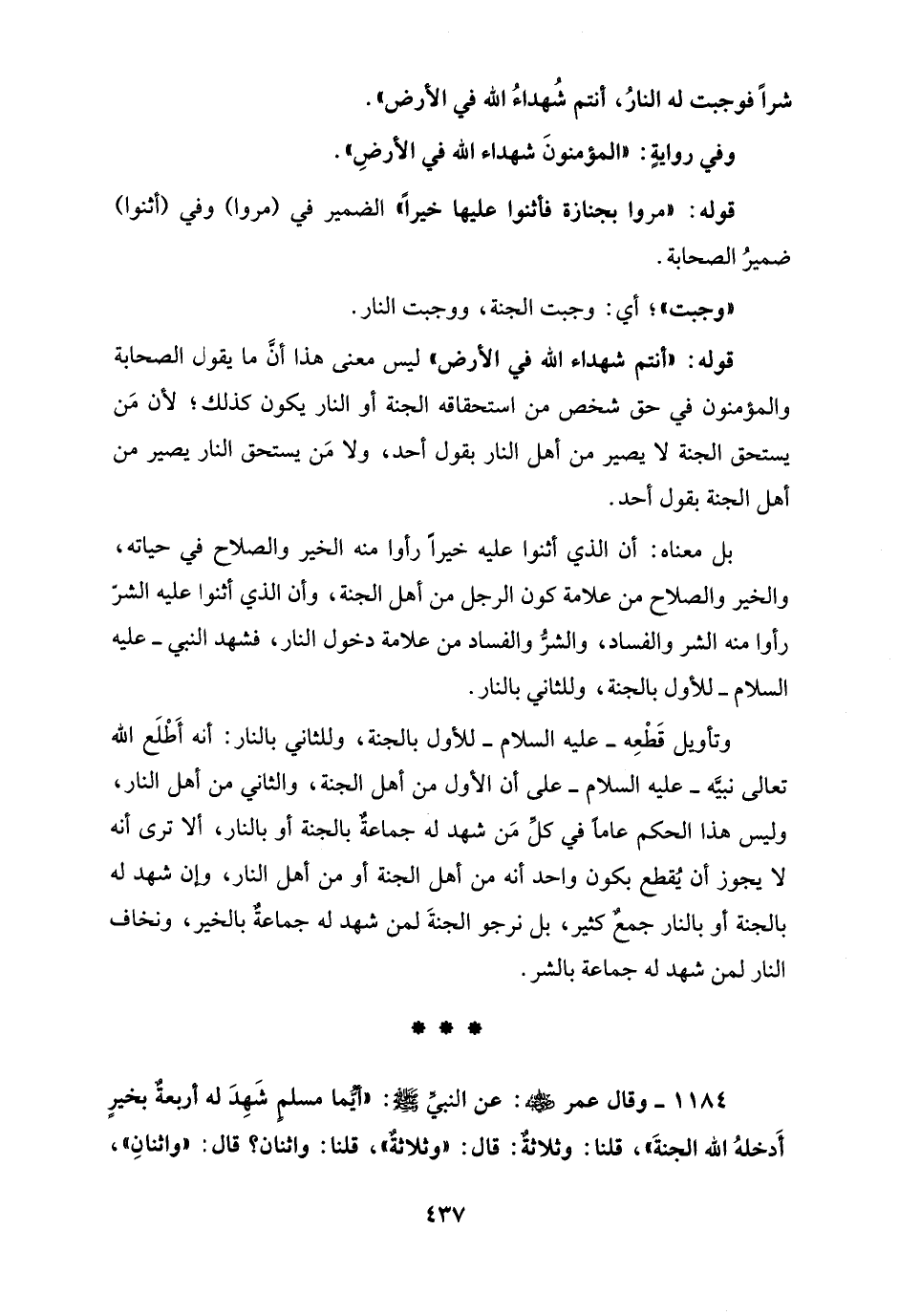 وتأويل قَطْعِه - عليه السلام - للأول بالجنة، وللثاني بالنار: أنه أَطْلَع الله تعالى نبيَّه - عليه السلام - على أن الأول من أهل الجنة، والثاني من أهل النار، وليس هذا الحكم عامًا في كلِّ مَن شهد له جماعةٌ بالجنة أو بالنار، ألا ترى أنه لا يجوز أن يُقطع بكون واحد أنه من أهل الجنة أو من أهل النار، وإن شهد له بالجنة أو بالنار جمعٌ كثير، بل نرجو الجنَّةَ لمن شهد له جماعةٌ بالخير، ونخاف النار لمن شهد له جماعة بالشر.