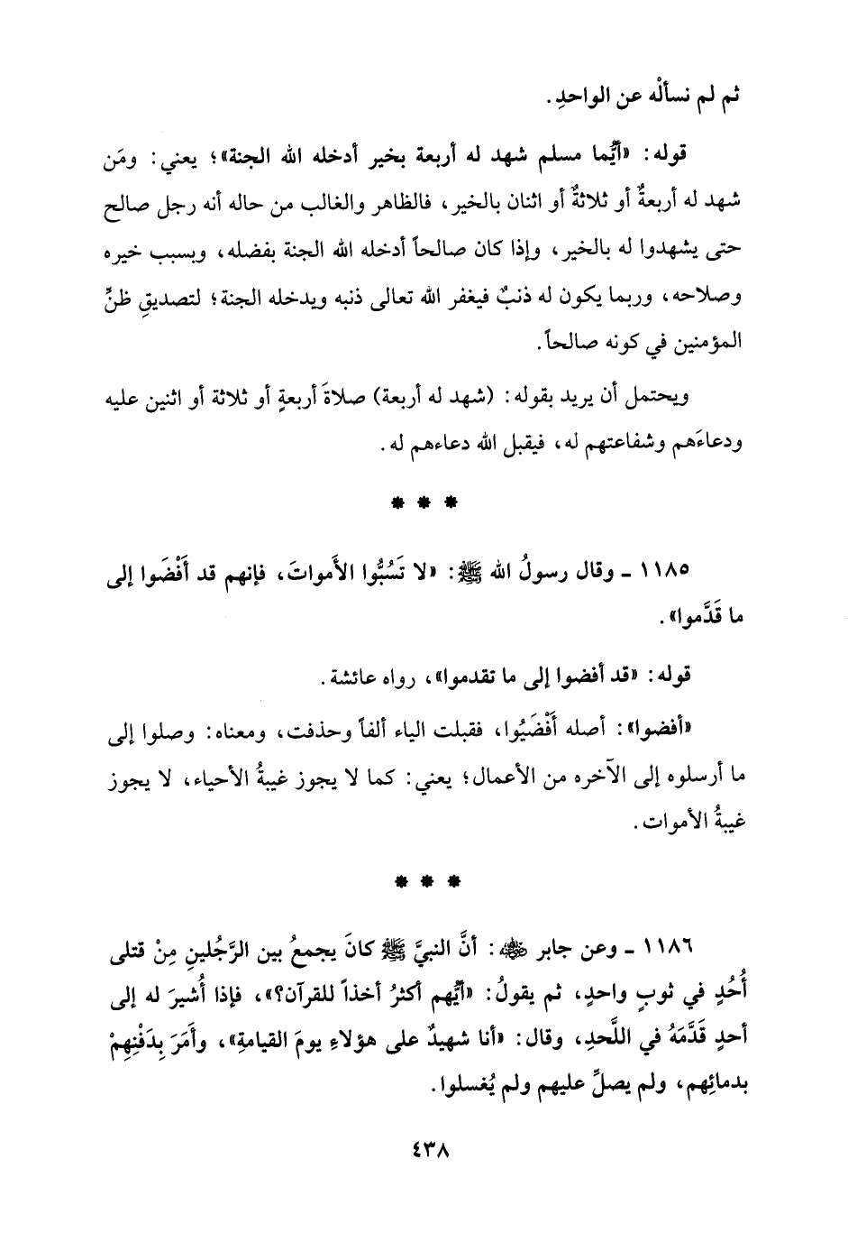 1185 - وقال رسولُ الله - صلى الله عليه وسلم -: "لا تَسُبُّوا الأَمواتَ، فإنهم قد أَفْضَوا إلى ما قَدَّموا".
