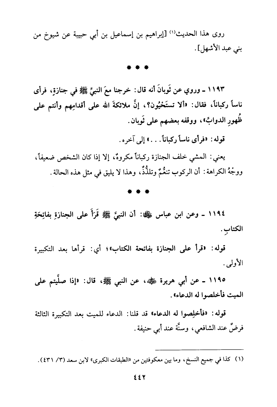 1193 - وروي عن ثَوبانَ أنه قال: خرجنا معَ النبيِّ - صلى الله عليه وسلم - في جنازةٍ، فرأى ناسًا ركبانًا، فقال: "ألا تستَحْيُون؟، إنَّ ملائكةَ الله على أقدامِهم وأنتم على ظُهورِ الدوابِّ"، ووقفه بعضهم على ثَوبان.