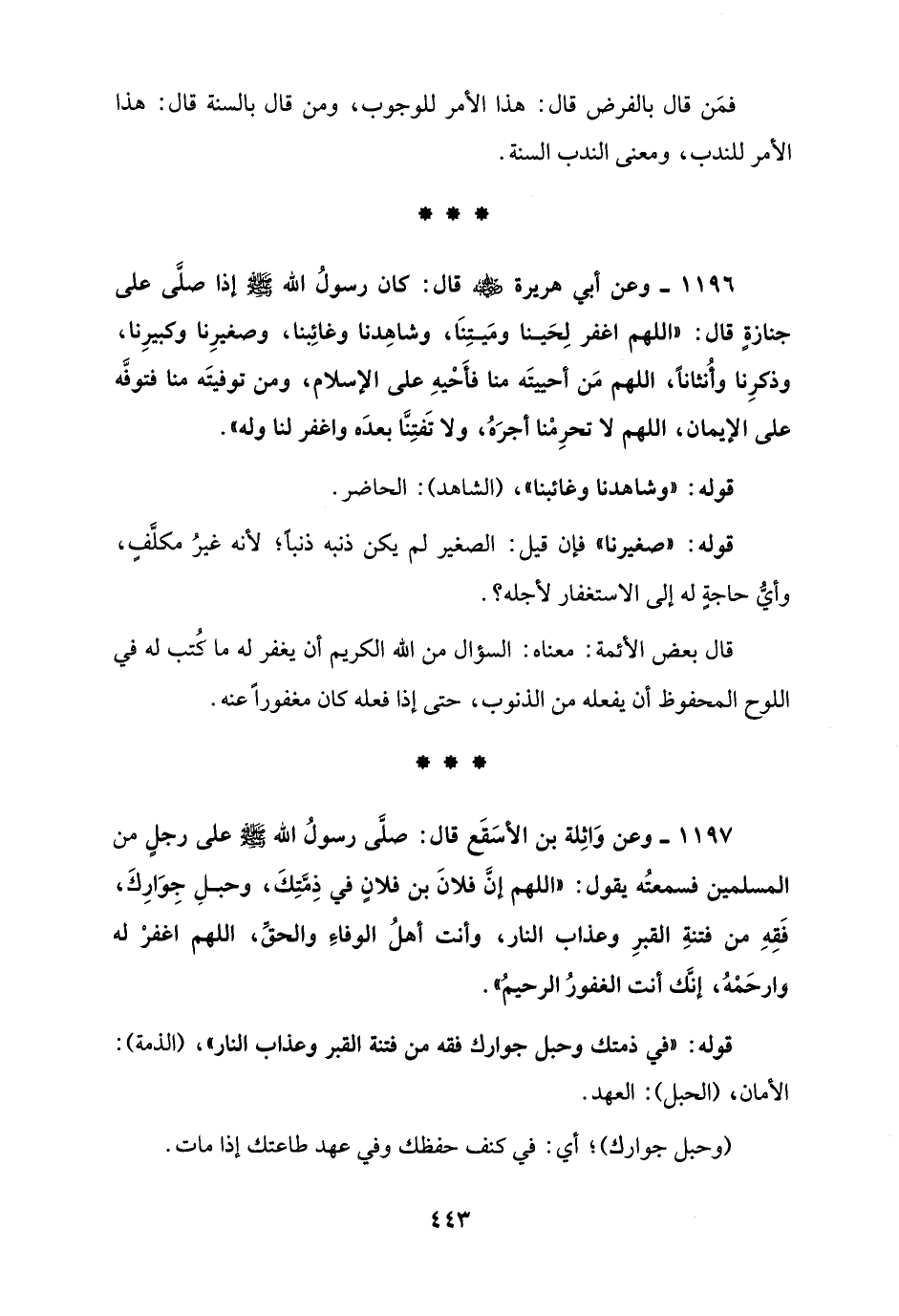 1196 - وعن أبي هريرة - رضي الله عنه - قال: كان رسولُ الله - صلى الله عليه وسلم - إذا صلَّى على جنازةٍ قال: "اللهم اغفر لِحَينا ومَيتِنَا، وشاهِدنا وغائِبنا، وصغيرِنا وكبيرِنا، وذكرِنا وأُنثانا، اللهم مَن أحييتَه منا فأَحْيهِ على الإسلام، ومن توفيتَه منا فتوفَّه على الإيمان، اللهم لا تحرِمْنا أجرَهُ، ولا تَفتِنَّا بعدَه واغفر لنا وله".