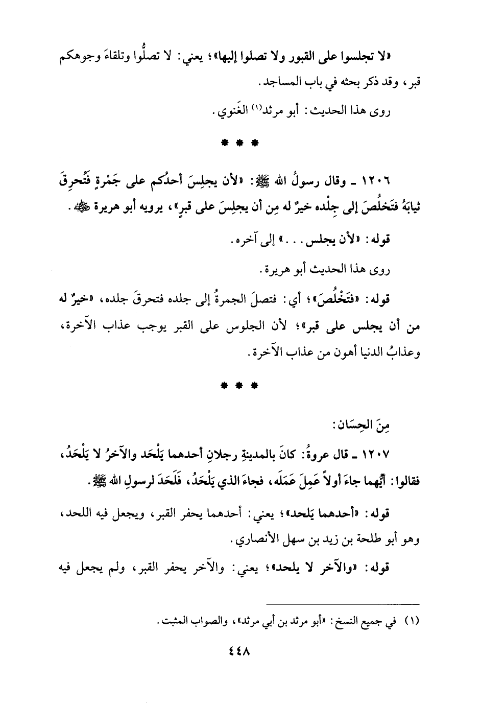 1206 - وقال رسولُ الله - صلى الله عليه وسلم -: "لأن يجلِسَ أحدُكم على جَمْرةٍ فَتُحرِقَ ثيابَهُ فتَخلُصَ إلى جِلْده خيرٌ له مِن أن يجلِسَ على قبرٍ"، يرويه أبو هريرة - رضي الله عنه -.