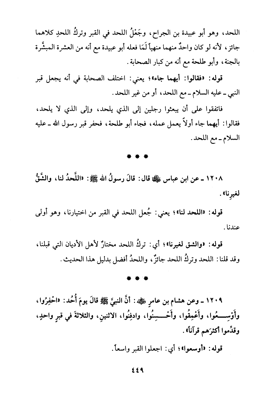 اللحد، وهو أبو عبيدة بن الجراح، وجَعْلُ اللحد في القبر وتركُ اللحدِ كلاهما جائز، لأنه لو كان واحدٌ منهما منهيًا لَمَا فعله أبو عبيدة مع أنه من العشرة المبشَّرة بالجنة، وأبو طلحة مع أنه من كبار الصحابة.