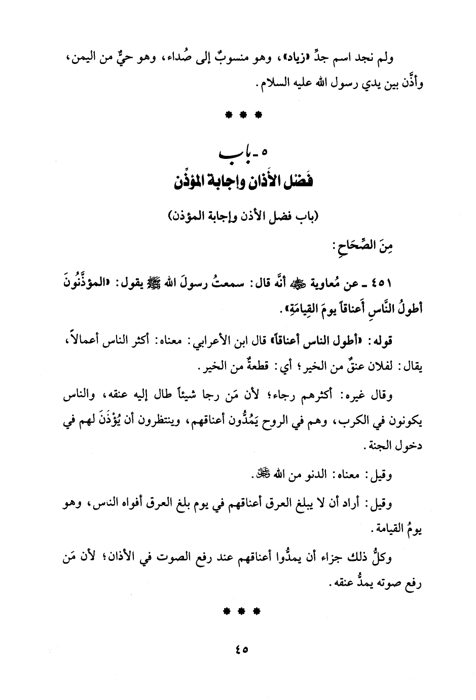 451 - عن مُعاوية - رضي الله عنه - أنَّه قال: سمعتُ رسولَ الله - صلى الله عليه وسلم - يقول: "المؤذَّنُونَ أطولُ النَّاسِ أَعناقًا يومَ القِيامَةِ".