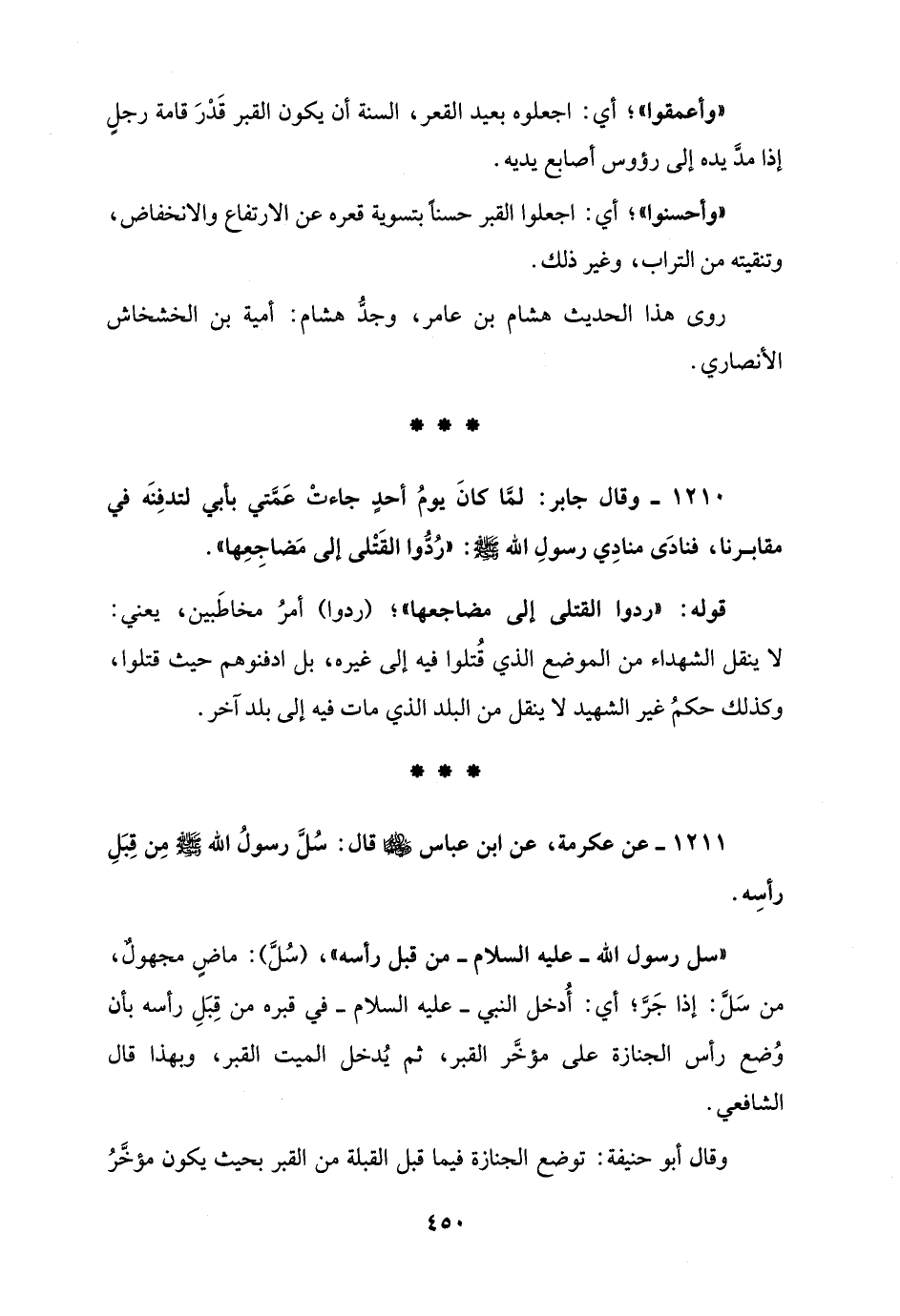 1210 - وقال جابر: لمَّا كانَ يومُ أحدٍ جاءتْ عَمَّتي بأبي لتدفِنَه في مقابرنا، فنادَى منادِي رسولِ الله - صلى الله عليه وسلم -: "رُدُّوا القَتْلى إلى مَضاجِعِها".