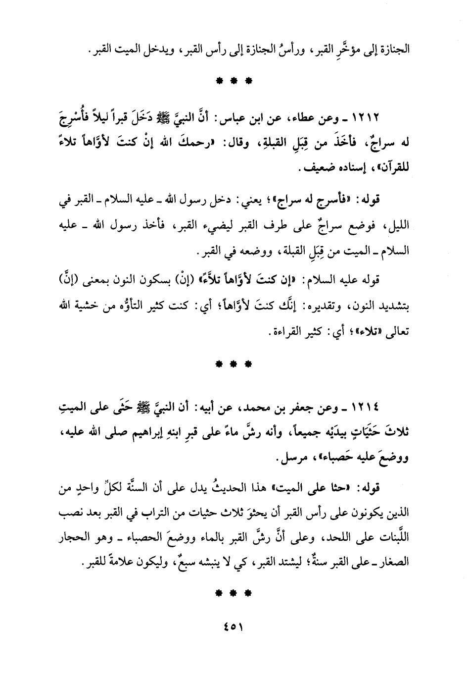 1212 - وعن عطاء، عن ابن عباس: أنَّ النبيَّ - صلى الله عليه وسلم - دَخَلَ قبرًا ليلاً فأُسْرِجَ له سراجٌ، فأخَذَ من قِبَلِ القبلةِ، وقال: "رحمكَ الله إنْ كنتَ لأوَّاهًا تلاءً للقرآن"، إسناده ضعيف.