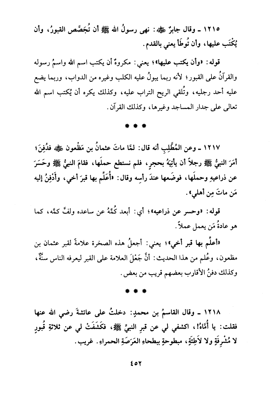1215 - وقال جابرٌ - رضي الله عنه -: نهى رسولُ الله - صلى الله عليه وسلم - أن تُجَصَّص القبورُ، وأن يُكْتَب عليها، وأن تُوطَأ يعني بالقدم.