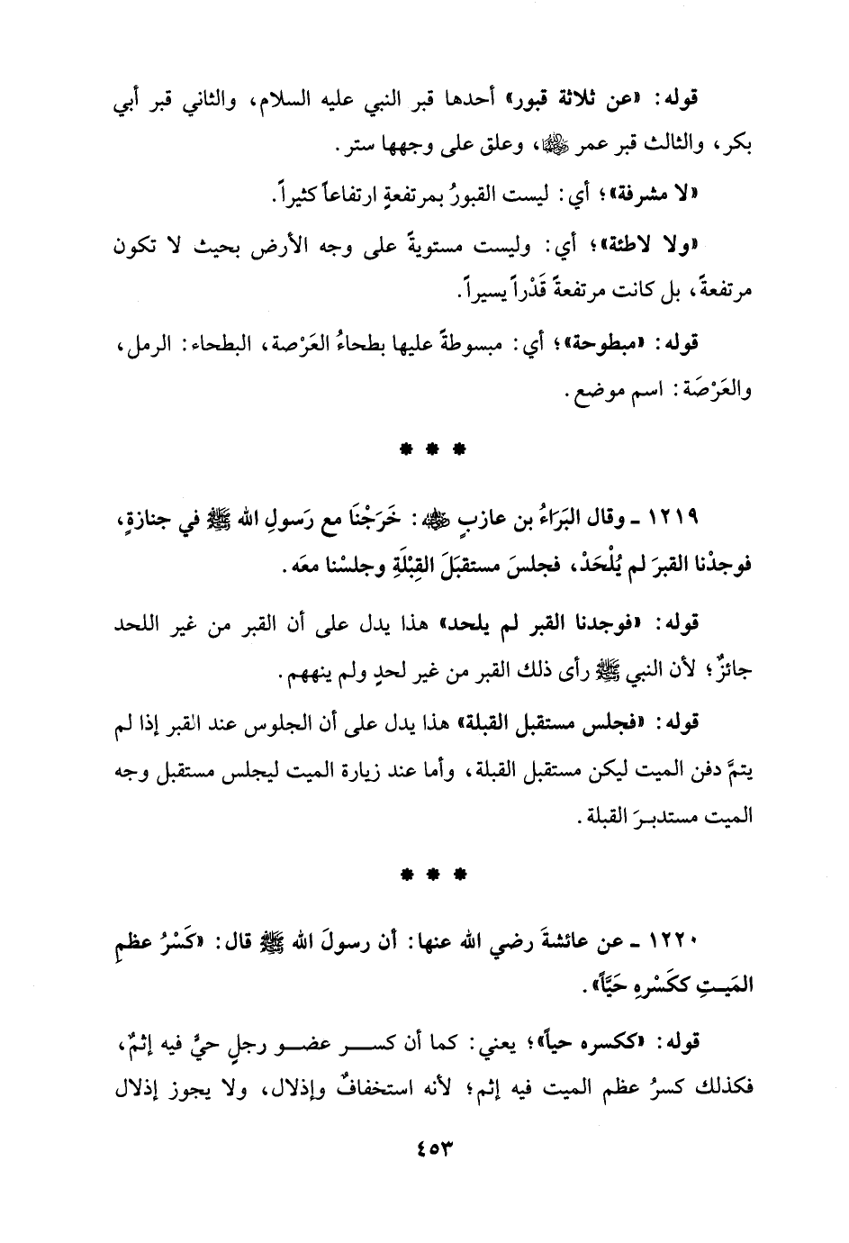 1220 - عن عائشةَ رضي الله عنها: أن رسولَ الله - صلى الله عليه وسلم - قال: "كَسْرُ عظمِ المَيتِ ككَسْرهِ حَيَّاً".