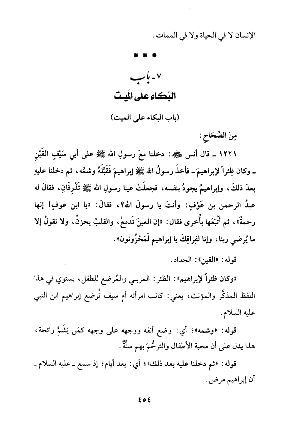 1221 - قال أنس - رضي الله عنه -: دخلنا معَ رسولِ الله - صلى الله عليه وسلم - على أبي سَيْفٍ القَيْنِ - وكان ظِئرًا لإبراهيمَ - فأخذَ رسولُ الله - صلى الله عليه وسلم - إبراهيمَ فَقَبَّلَهُ وشمَّه، ثم دخلنا عليهِ بعدَ ذلكَ، وإبراهيمُ يجودُ بنفسه، فجعلَتْ عينا رسولِ الله - صلى الله عليه وسلم - تَذْرِفَانِ، فقالَ له عبدُ الرحمن بن عَوْفٍ: وأنتَ يا رسولَ الله؟، فقالَ: "يا ابن عوفٍ! إنها رحمةٌ"، ثم أَتْبَعَها بأُخرى فقال: "إن العينَ تَدمعُ، والقلبُ يحزنُ، ولا نقولُ إلا ما يُرضي ربنا، وإنا لفِراقِكَ يا إبراهيم لَمَحْزُونون".