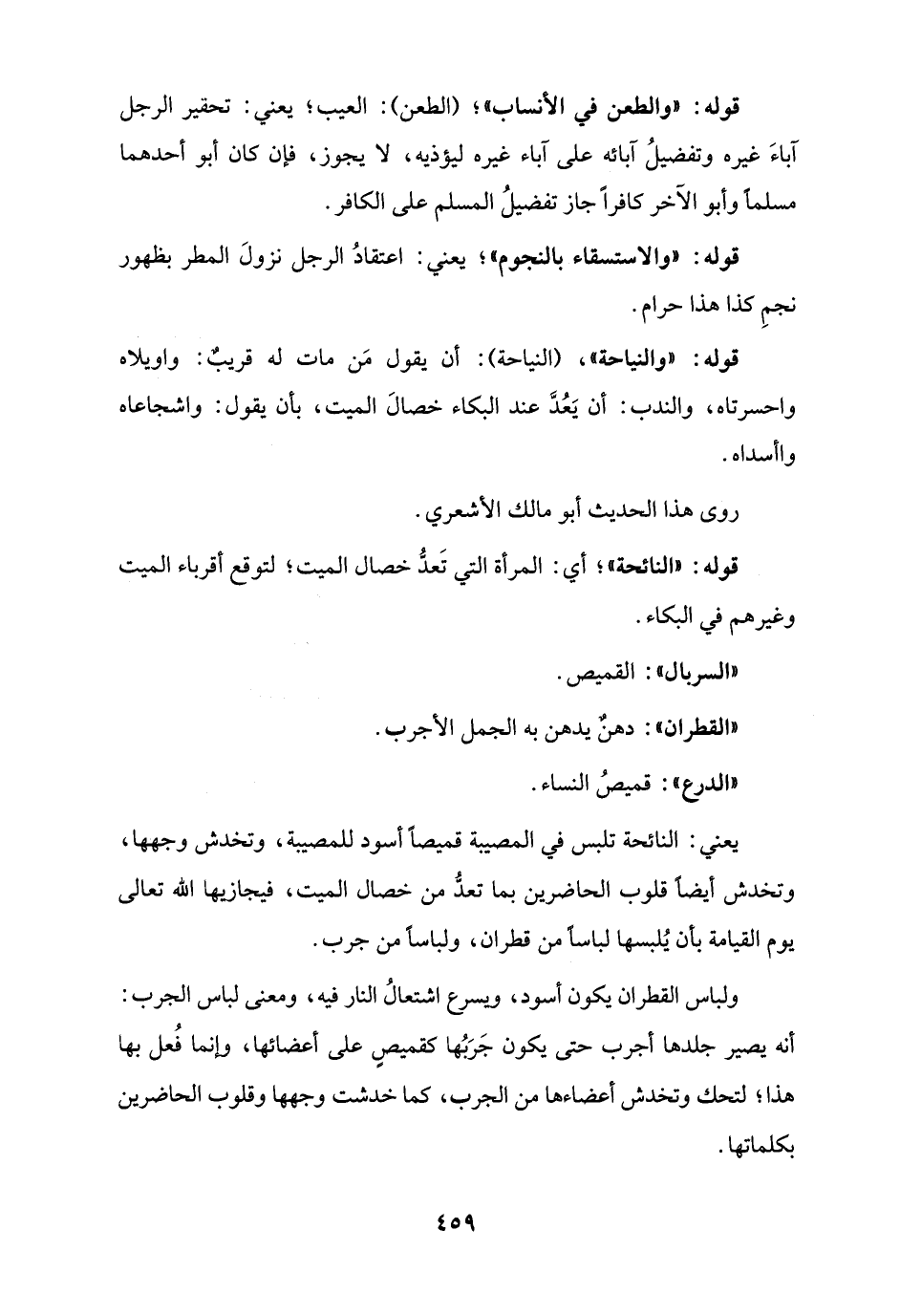 قوله: "والطعن في الأنساب"؛ (الطعن): العيب؛ يعني: تحقير الرجل آباءَ غيره وتفضيلُ آبائه على آباء غيره ليؤذيه، لا يجوز، فإن كان أبو أحدهما مسلمًا وأبو الآخر كافرًا جاز تفضيلُ المسلم على الكافر.