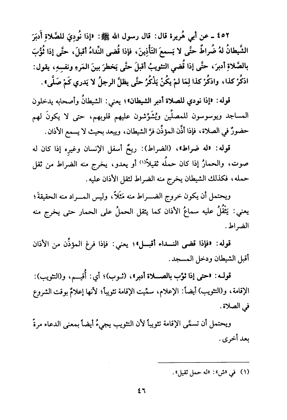 452 - عن أبي هُريرة قال: قال رسول الله - صلى الله عليه وسلم -: "إذا نُودِيَ للصَّلاةِ أَدبَرَ الشَّيطانُ لهُ ضُراطٌ حتَّى لا يَسمعَ التَأْذِينَ، فإذا قُضى النِّداءُ أقبلَ، حتَّى إذا ثُوُّبَ بالصَّلاةِ أدبرَ، حتَّى إذا قُضي التثويبُ أقبلَ حتَّى يَخطرَ بينَ المَرءِ ونفسِهِ، يقول: اذكُرْ كذا، واذكُرْ كذا لِمَا لمْ يكُنْ يَذْكُرُ حتَّى يظلَّ الرجلُ لا يَدري كَمْ صَلَّى".