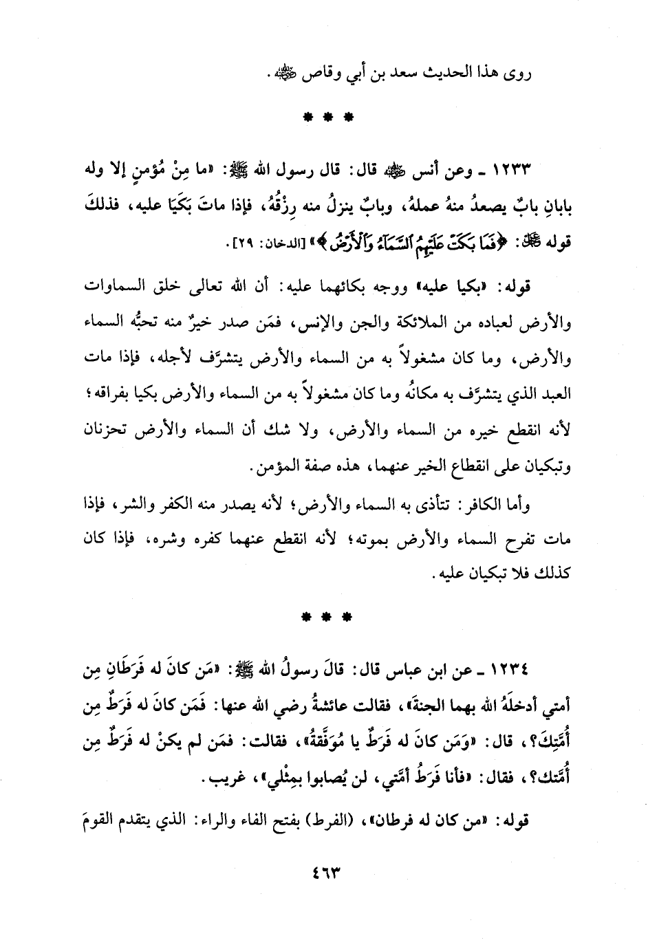 1233 - وعن أنس - رضي الله عنه - قال: قال رسول الله - صلى الله عليه وسلم -: "ما مِنْ مُؤمنٍ إلا وله بابانِ بابٌ يصعدُ منهُ عملهُ، وبابٌ ينزلُ منه رِزْقُهُ، فإذا ماتَ بَكَيَا عليه، فذلكَ قوله - عز وجل -: {فَمَا بَكَتْ عَلَيْهِمُ السَّمَاءُ وَالْأَرْضُ} [الدخان: 29].