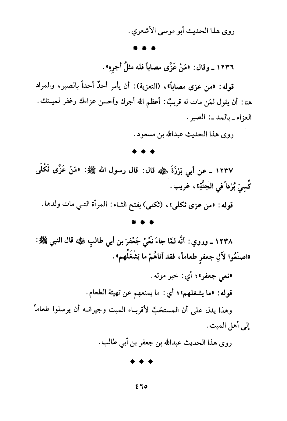 1238 - وروي: أنَّه لمَّا جاءَ نَعْيُ جَعْفرَ بن أبي طالبٍ - رضي الله عنه - قال النبي - صلى الله عليه وسلم -: "اصنَعُوا لآلِ جعفرٍ طعامًا، فقد أتاهُمْ ما يَشْغَلُهم".