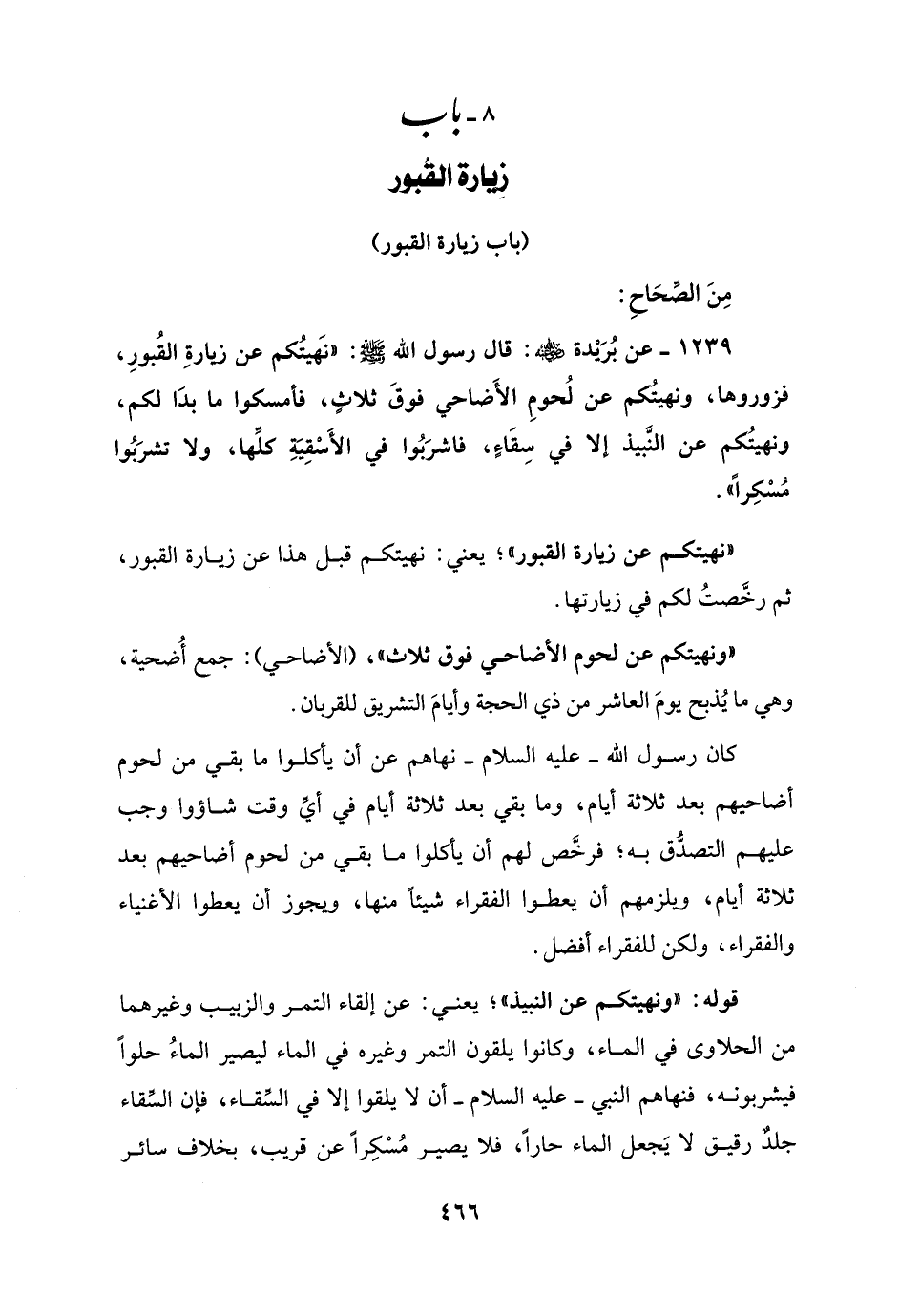 1239 - عن بُرَيْدة - رضي الله عنه -: قال رسول الله - صلى الله عليه وسلم -: "نَهيتُكم عن زيارةِ القبورِ، فزوروها، ونهيتُكم عن لُحومِ الأَضاحي فوقَ ثلاثٍ، فأمسكوا ما بدَا لكم، ونهيتُكم عن النَّبيذ إلا في سِقَاءٍ، فاشرَبُوا في الأَسْقِيَةِ كلِّها، ولا تشرَبُوا مُسْكِرًا".