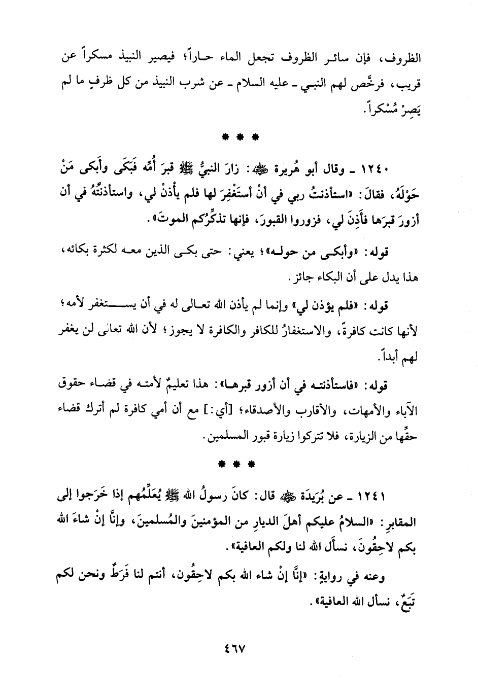 1240 - وقال أبو هُريرة - رضي الله عنه -: زارَ النبيُّ - صلى الله عليه وسلم - قبرَ أُمِّه فَبَكَى وأَبكى مَنْ حَوْلَهُ، فقالَ: "استأذنتُ ربي في أنْ أستَغْفِرَ لها فلم يأْذنْ لي، واستأذنْتُهُ في أن أزورَ قبرَها فأَذِنَ لي، فزوروا القبورَ، فإنها تذكِّرُكم الموتَ".