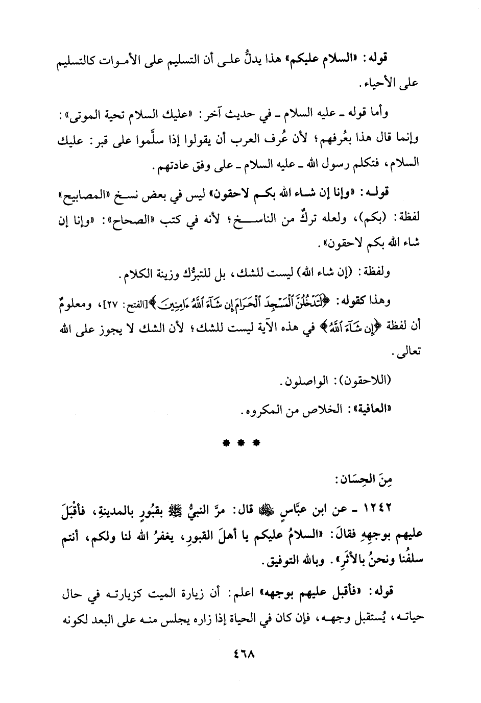 1242 - عن ابن عبَّاسٍ - رضي الله عنهما - قال: مرَّ النبيُّ - صلى الله عليه وسلم - بقبُورٍ بالمدينةِ، فأقْبَلَ عليهم بوجهِهِ فقالَ: "السلامُ عليكم يا أهلَ القبورِ، يغفرُ الله لنا ولكم، أنتم سلفُنا ونحنُ بالأثَرِ". وبالله التوفيق.