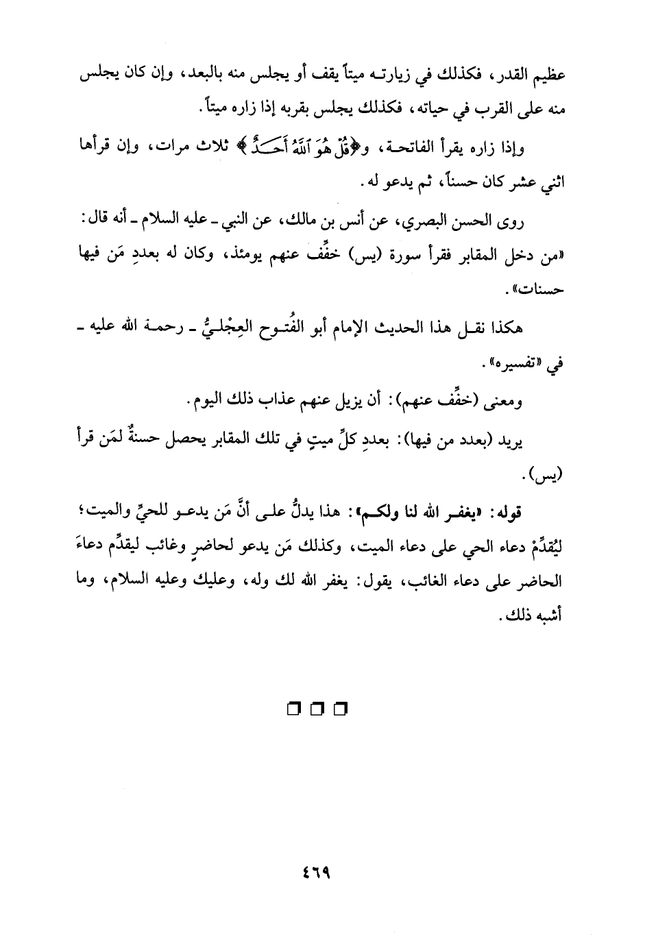 وإذا زاره يقرأ الفاتحة، و {قُلْ هُوَ اللَّهُ أَحَدٌ} ثلاث مرات، وإن قرأها اثني عشر كان حسنًا، ثم يدعو له.