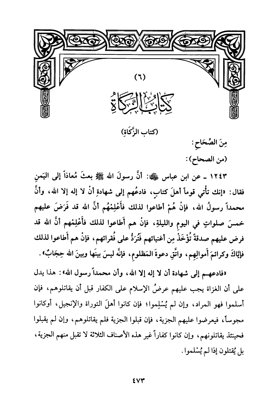 1243 - عن ابن عباس - رضي الله عنهما -: أنَّ رسولَ الله - صلى الله عليه وسلم - بعثَ مُعاذًا إلى اليَمنِ فقال: "إنك تأْتي قومًا أهلَ كتابٍ، فادعُهم إلى شهادةِ أنْ لا إله إلا الله، وأنَّ محمدًا رسولُ الله، فإنْ هُمْ أطاعوا لذلك فأَعْلِمْهُم أنَّ الله قد فَرَضَ عليهم خمسَ صلواتٍ في اليومِ والليلةِ، فإنْ هم أَطاعوا لذلك فأعْلِمْهم أنَّ الله قد فرض عليهم صدقةً تُؤْخَذْ مِن أغنيائهم فَتُرَدُّ على فُقرائهم، فإنْ هم أَطاعوا لذلك فإيَّاكَ وكرائمَ أَموالِهِم، واتَّقِ دعوةَ المَظلومِ، فإنَّه ليسَ بينَها وبينَ الله حِجَابٌ".