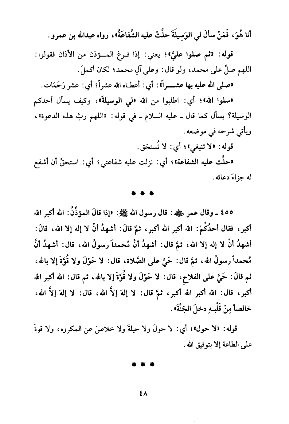 455 - وقال عمر - رضي الله عنه -: قال رسول الله - صلى الله عليه وسلم -: "إذا قالَ المؤذِّنُ: الله أكبر الله أكبر، فقال أحدُكُمْ: الله أكبر الله أكبر، ثمَّ قالَ: أشهدُ أنْ لا إله إلا الله، قالَ: أشهدُ أنْ لا إله إلا الله، ثمَّ قال: أشهدُ أنَّ مُحمدًا رسولُ الله، قال: أشهدُ أنَّ مُحمدًا رسولُ الله، ثمَّ قال: حَيَّ على الصَّلاة، قال: لا حَوْلَ ولا قُوَّةَ إلا بالله، ثم قالَ: حَيَّ على الفلاحِ، قال: لا حَوْلَ ولا قُوَّةَ إلا بالله، ثم قال: الله أكبر الله أكبر، قال: الله أكبر الله أكبر، ثمَّ قال: لا إلهَ إلاَّ الله، قال: لا إلهَ إلاَّ الله، خالصًا مِنْ قَلْبهِ دخلَ الجَنَّةَ".