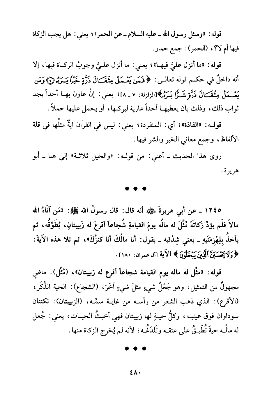 1245 - عن أبي هريرةَ - رضي الله عنه - أنه قال: قال رسولُ الله - صلى الله عليه وسلم -: "مَن آتَاهُ الله مالًا فلَم يؤدِّ زَكاتَهُ مُثِّلَ له مالُه يومَ القيامةِ شُجاعًا أقرعَ له زَبيبتانِ، يُطَوِّقُه، ثم يأخذُ بِلِهْزِمَتَيهِ - يعني شِدْقيه - يقول: أنا مالُكَ أنا كنزُكَ"، ثم تلا هذه الآيةَ: {وَلَا يَحْسَبَنَّ الَّذِينَ يَبْخَلُونَ} الآية [آل عمران: 180].
