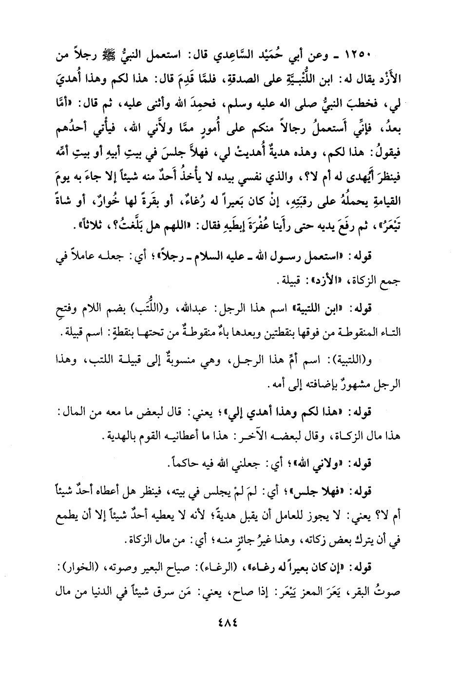 1250 - وعن أبي حُمَيْد السَّاعِدي قال: استعمل النبيُّ - صلى الله عليه وسلم - رجلًا من الأَزْد يقال له: ابن اللُّتْبيَّةِ على الصدقةِ، فلمَّا قَدِمَ قال: هذا لكم وهذا أُهديَ لي، فخطبَ النبيُّ صلى الله عليه وسلم، فحمِدَ الله وأثنى عليه، ثم قال: "أمَّا بعدُ، فإنِّي أَستعملُ رجالًا منكم على أُمورٍ ممَّا ولاَّني الله، فيأْتي أحدُهم فيقولُ: هذا لكم، وهذه هديةٌ أُهديتْ لي، فهلاَّ جلسَ في بيتِ أبيهِ أو بيتِ أمِّه فينظرَ أَيُهدى له أم لا؟، والذي نفسي بيده لا يأْخذُ أَحدٌ منه شيئًا إلا جاءَ به يومَ القيامةِ يحملُهُ على رقبَتِهِ، إنْ كان بَعيرًا له رُغاءٌ، أو بقَرةً لها خُوارٌ، أو شاةً تَيْعَرُ"، ثم رفَعَ يديه حتى رأَينا عُفْرَةَ إبطَيهِ فقال: "اللهم هل بَلَّغتُ؟، ثلاثًا".