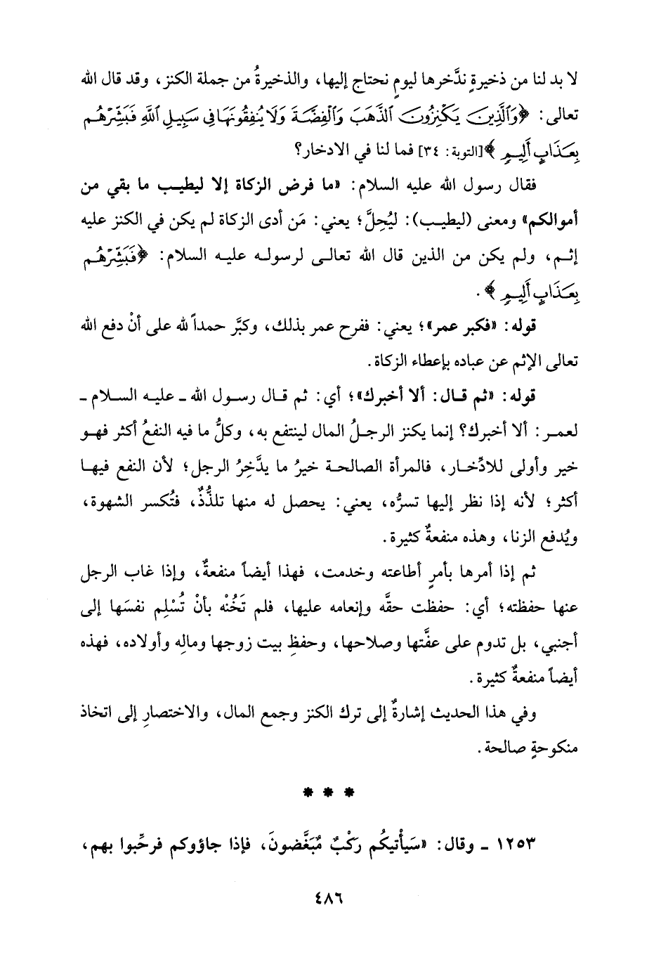 فقال رسول الله عليه السلام: "ما فرض الزكاة إلا ليطيب ما بقي من أموالكم" ومعنى (ليطيب): ليُحِلَّ؛ يعني: مَن أدى الزكاة لم يكن في الكنز عليه إثم، ولم يكن من الذين قال الله تعالى لرسوله عليه السلام: {فَبَشِّرْهُمْ بِعَذَابٍ أَلِيمٍ}
