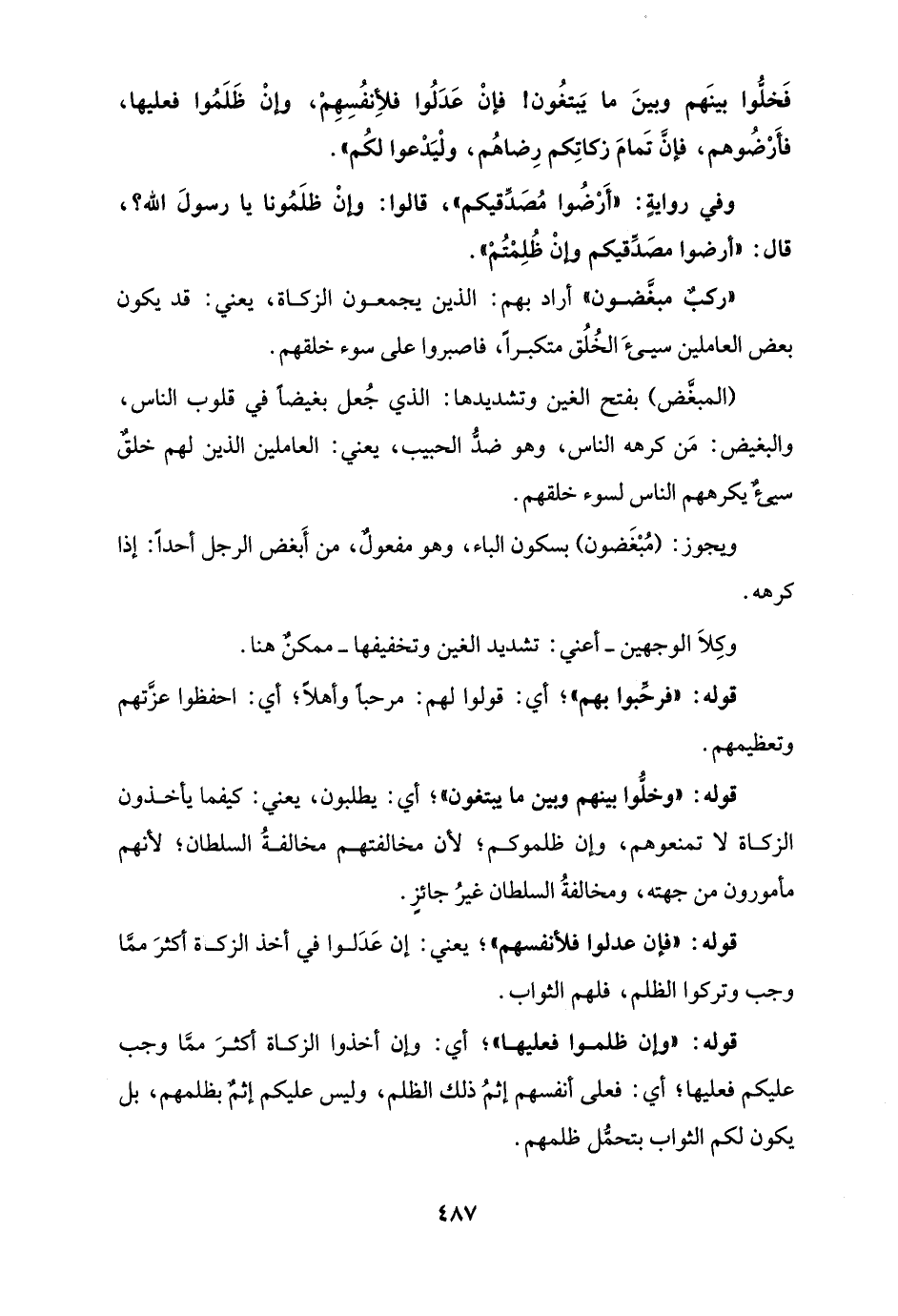 فَخلُّوا بينَهم وبينَ ما يَبتغُون! فإنْ عَدَلُوا فلأِنفُسِهِمْ، وإنْ ظَلَمُوا فعليها، فأَرْضُوهم، فإنَّ تَمامَ زكاتِكم رِضاهُم، ولْيَدْعوا لكُم".