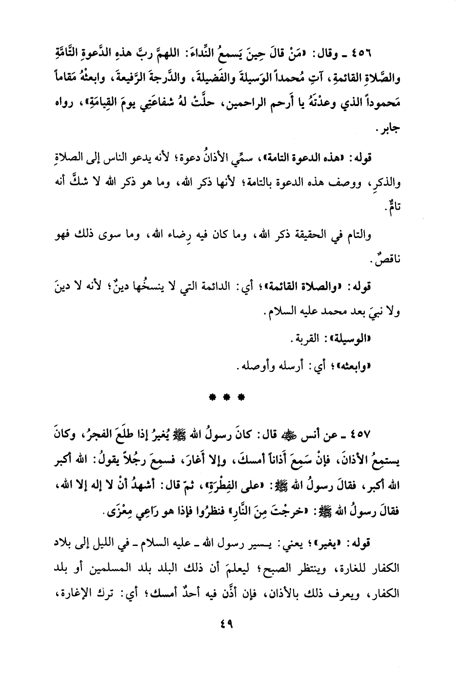 457 - عن أنس - رضي الله عنه - قال: كانَ رسولُ الله - صلى الله عليه وسلم - يُغيرُ إذا طلَعَ الفجرُ، وكانَ يستمِعُ الأذانَ، فإنْ سَمِعَ أَذانًا أمسكَ، وإلا أَغارَ، فسمعَ رجُلًا يقولُ: الله أكبر الله أكبر، فقالَ رسولُ الله - صلى الله عليه وسلم -: "على الفِطْرَةِ"، ثمّ قال: أشهدُ أنْ لا إله إلا الله، فقالَ رسولُ الله - صلى الله عليه وسلم -: "خرجْتَ مِنَ النَّارِ" فنظرُوا فإذا هو رَاعي مِعْزَى.