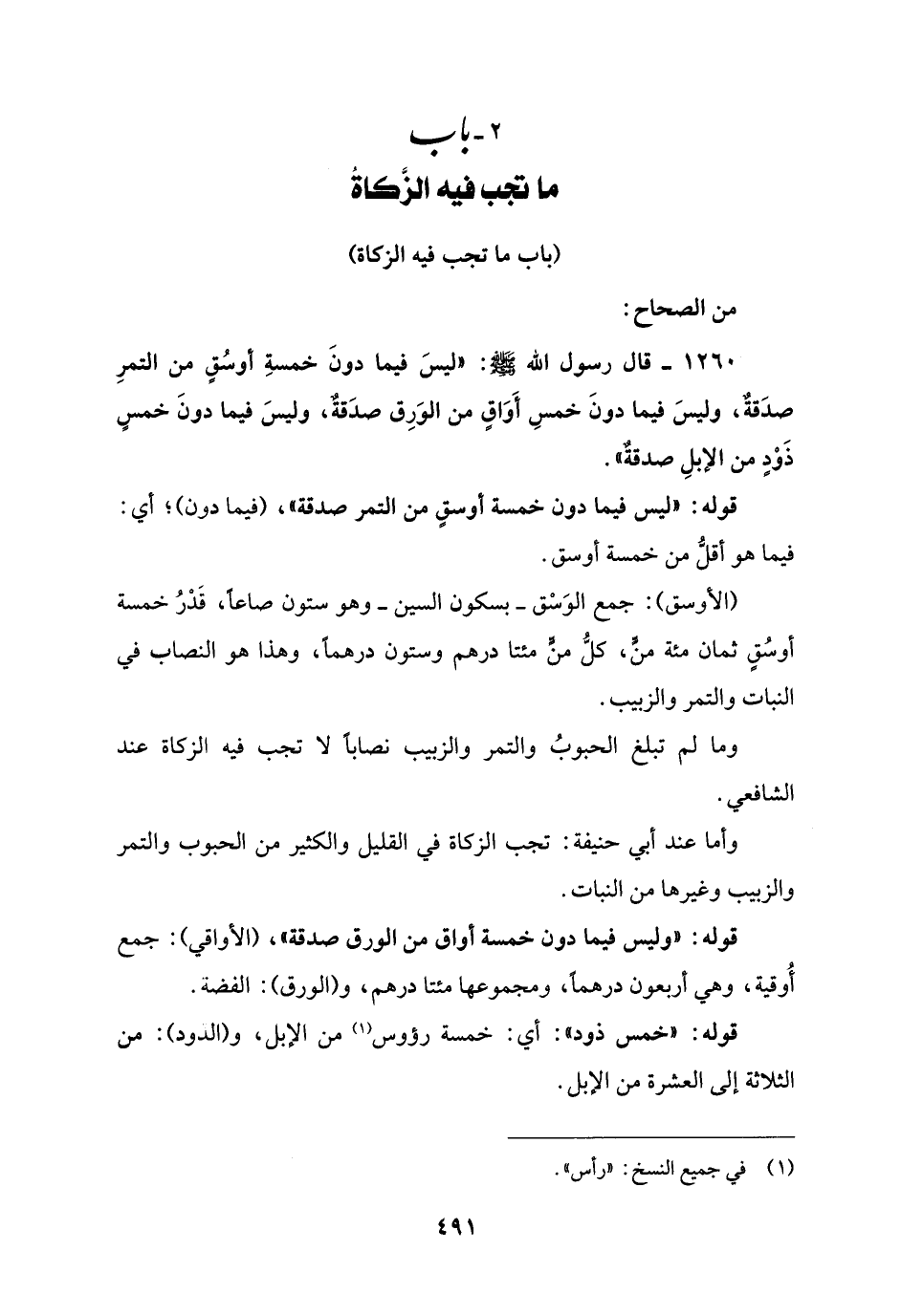 1260 - قال رسول الله - صلى الله عليه وسلم -: "ليسَ فيما دونَ خمسةِ أوسُقٍ من التمرِ صدَقةٌ، وليسَ فيما دونَ خمسِ أَوَاقٍ من الوَرِق صدَقةٌ، وليسَ فيما دونَ خمسٍ ذَوْدٍ من الإبلِ صدقةٌ".