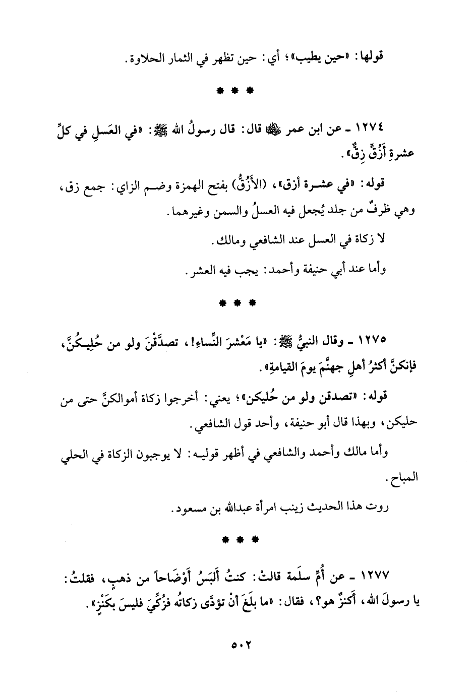 1274 - عن ابن عمر - رضي الله عنهما - قال: قال رسولُ الله - صلى الله عليه وسلم -: "في العَسلِ في كلِّ عشرةِ أَزُقٍّ زِقٌّ".