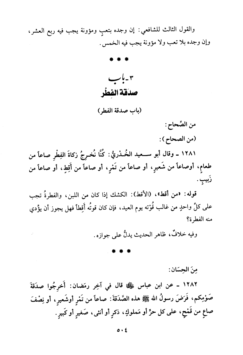 1281 - وقال أبو سعيد الخُدْريُّ: كُنَّا نُخرِجُ زكاةَ الفِطْرِ صاعًا من طعامٍ، أو صاعًا من شَعيرٍ، أو صاعًا من تَمْرٍ، أو صاعًا من أَقِطٍ، أو صاعًا من زَبيبٍ.