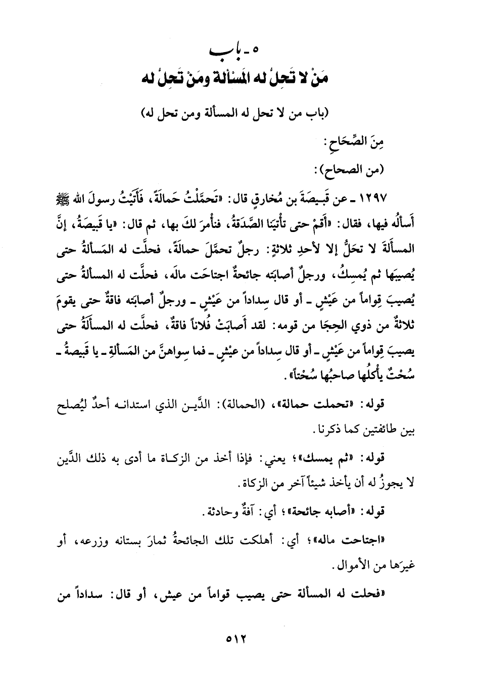 1297 - عن قَبيصَةَ بن مُخارقٍ قال: "تَحمَّلْتُ حَمالَةً، فَأَتَيْتُ رسولَ الله - صلى الله عليه وسلم - أَسألُه فيها، فقال: "أَقمْ حتى تأْتيَنا الصَّدَقةُ، فنأْمرَ لكَ بها، ثم قال: "يا قَبيصَةُ، إنَّ المسأَلةَ لا تحَلُّ إلا لأحدِ ثلاثةٍ: رجلٌ تحمَّلَ حمالَةً، فحلَّت له المَسألةُ حتى يُصيبَها ثم يُمسِكُ، ورجلٌ أصابَته جائحةٌ اجتاحَت مالَه، فحلَّت له المسألةُ حتى يُصيبَ قِوامًا من عَيْشٍ - أو قال سِدادًا من عَيْشٍ - ورجلٌ أصابَته فاقةٌ حتى يقومَ ثلاثةٌ من ذوي الحِجَا من قومه: لقد أَصابَتْ فُلانًا فاقةٌ، فحلَّت له المسأَلَةُ حتى يصيبَ قِوامًا من عَيْشٍ - أو قال سِدادًا من عيْشٍ - فما سِواهنَّ من المَسألةِ - يا قَبيصةُ - سُحْتٌ يأْكْلُها صاحبُها سُحْتًا".